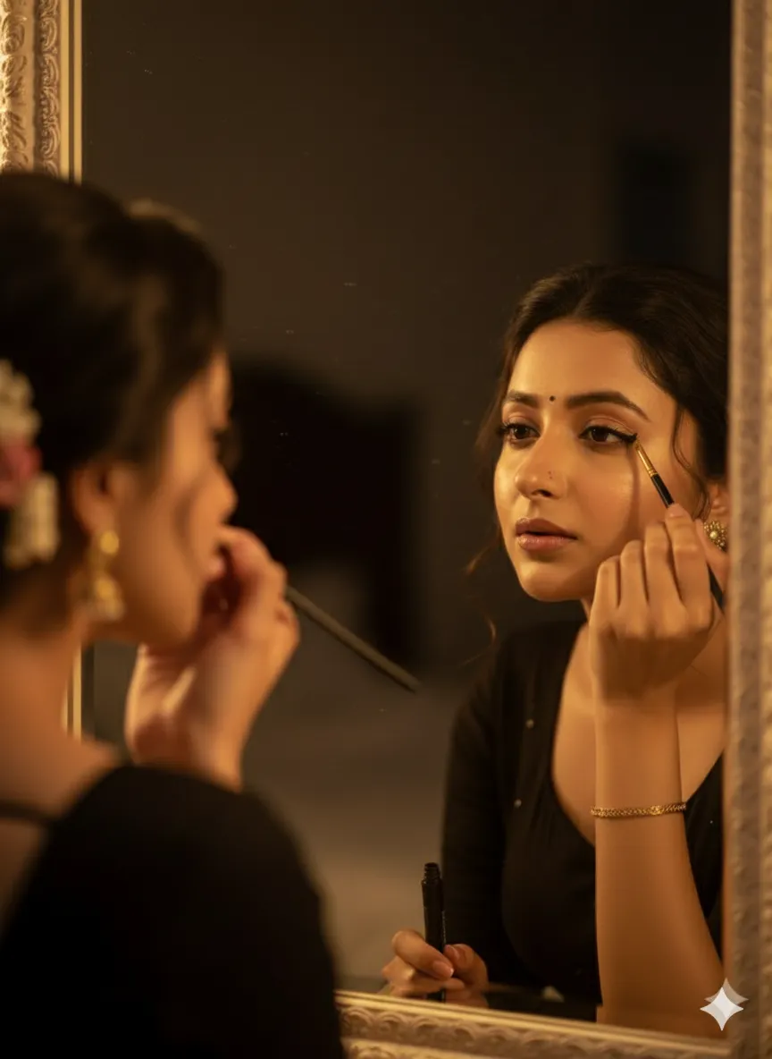 Cinematic portrait of a woman (image above) applying eyeliner in front of a mirror, warm soft lighting, elegant makeup,glossy lips, golden reflections, intimate and moody, ultra realistic, 8k resolution, professional fashion editorial style, shallow depth of field, photorealistic skin texture, dramatic light and shadow, soft cinematic glow, using my image create. 10 Hunyuan Image 3.0 Photo Editing Prompts