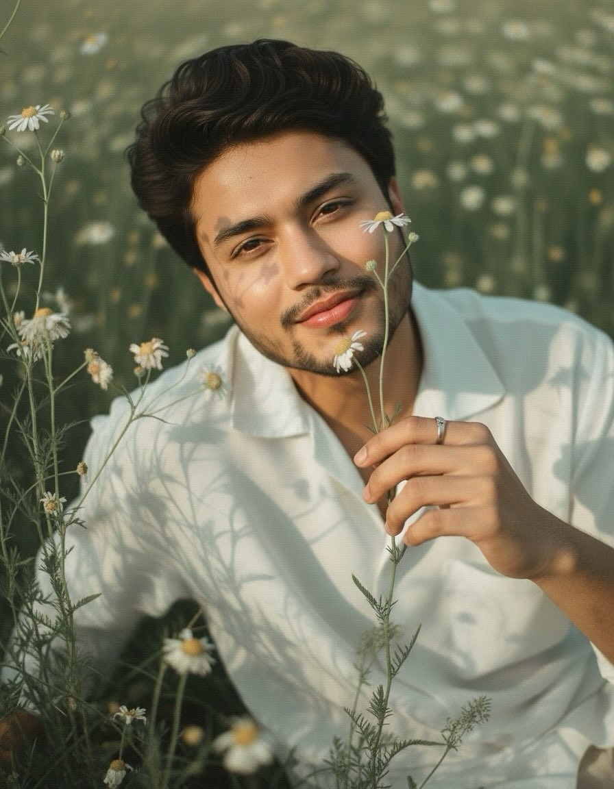 8k Hyper-realistic,DSLR-style portrait of a young man [ keep it face same from refrence image ] with natural soft look, with messy hair over the eye, wearing a loose white shirt, holding a vintage film camera. Standing in front of vibrant pink bougainvillea flowers under golden hour sunlight. Dreamy nostalgic cinematic vibe, 9:16 ratio, highly detailed, soft focus, realistic. Looking slightly right, one hand adjusting his hair.”