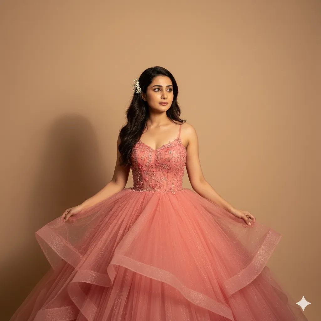 Front view, 4K realistic portrait of the same young Indian woman (face 100% identical to reference). Long dark wavy hair, white flowers behind right ear. Wearing pastel red Barbie-style gown with shimmering layers, floral details, flowing skirt. Looking slightly right, serene and graceful. Warm-toned wall background with warm light from right, casting soft-edged shadow. Retro, elegant, fairytale Barbie aura.”