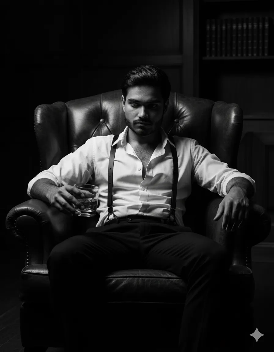 A cinematic black and white portrait of me, real face unchanged, seated dominantly in a dark leather armchair. Legs spread naturally, left arm resting on the armrest holding a tilted glass tumbler, right arm draped casually across the backrest. I wear a slightly wrinkled white button-down shirt, top buttons undone, with black suspenders and slim-fitted black trousers for a rugged, elegant look. My head tilts slightly downward, gazing at the ground with a calm, intense expression.