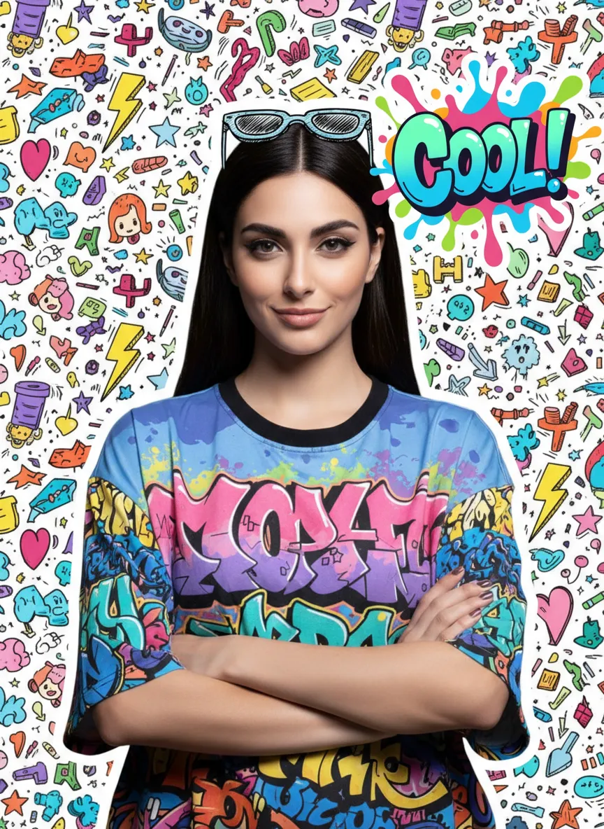 1/2 Ultra-realistic pop-art sticker-style portraits of [uploaded reference face, 100% alignment]. Bold neon doodles, emoji elements, speech bubbles, comic text, and playful outlined cutout effect. Vibrant gradient or graphic backdrops, crisp 4K clarity, fun expressive poses. Generate 6 distinct images as follows: Cheerful pastel hoodie with cartoon suns, clouds, and rainbows. Double peace sign pose, sparkling neon stars + “Yay!” text. Denim jacket covered in quirky patches.