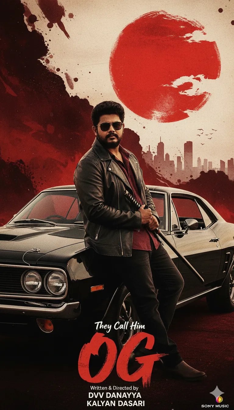 ** A cinematic movie poster featuring a stylish man(same facial features as uploaded)leaning casually against a black vintage car, holding a glass in his right hand. He wears a dark jacket over a maroon shirt, dark trousers, and sunglasses, exuding a cool and confident attitude. Behind him, the background blends Japanese-inspired ink wash art with dramatic red and black tones. A giant red sun dominates the sky, painted in a bold, textured brushstroke style, with the silhouette