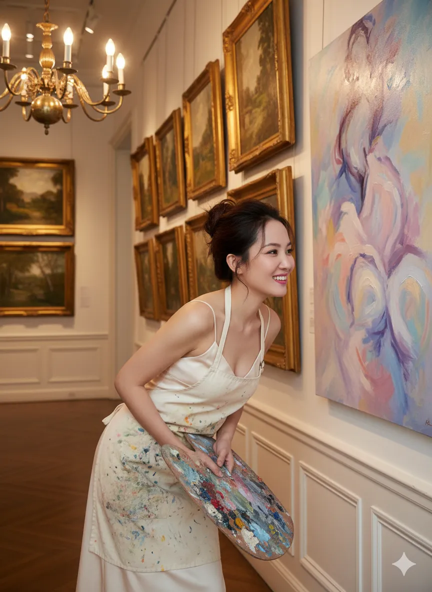 In a classic French gallery, the white-painted walls are hung with many oil paintings. A girl wearing a pearl-colored satin slip dress, a paint-stained apron over her shoulders, and holding a palette stained with paint, leans over and smiles as she looks at an abstract painting with many pastel purple, pink, and blue tones. Her hair is in a messy bun, a few strands falling over her face, and the warm yellow light from the chandelier creates a high-fashion editorial effect.