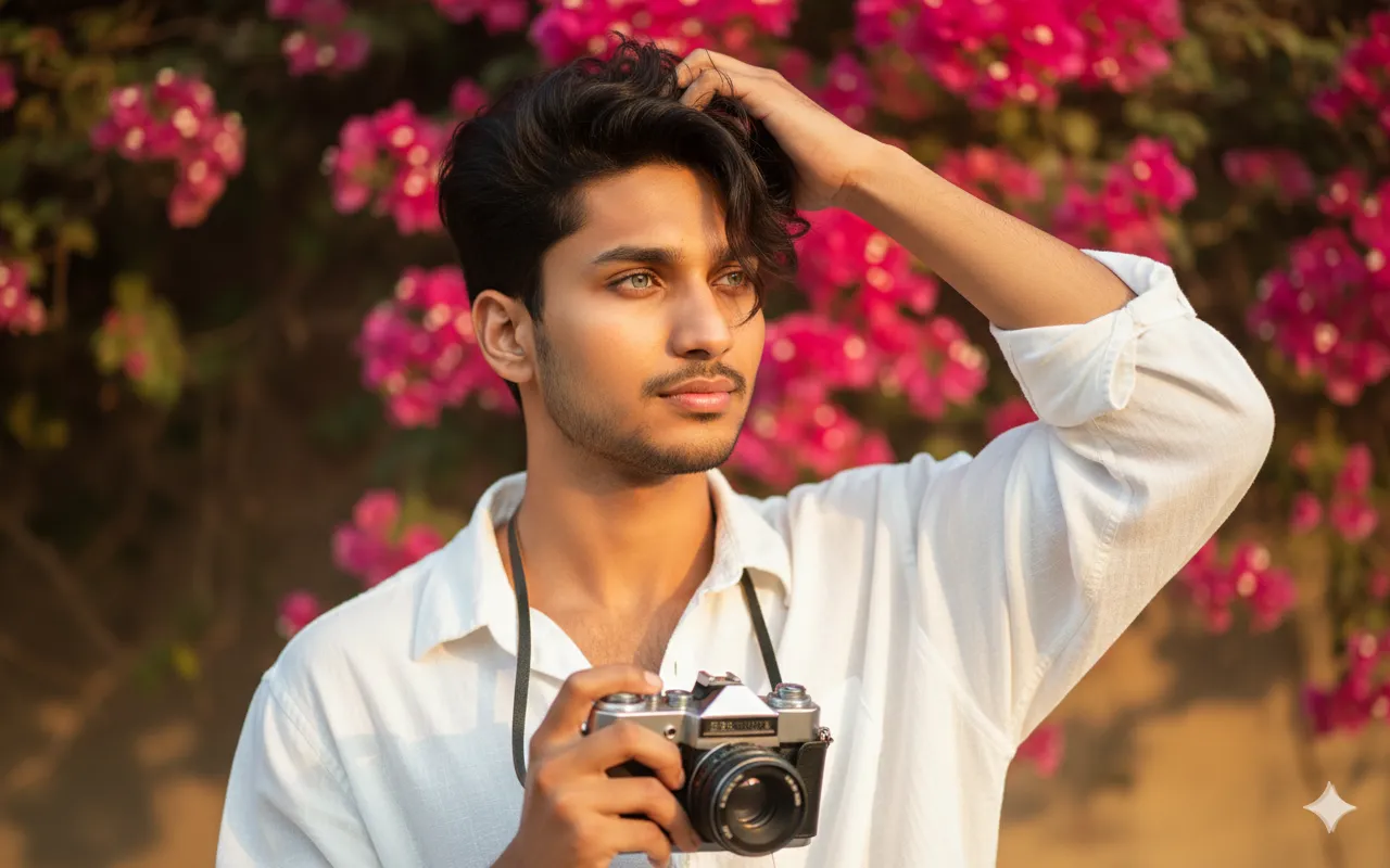 8k Hyper-realistic,DSLR-style portrait of a young man [ keep it face same from refrence image ] with natural soft look, with messy hair over the eye, wearing a loose white shirt, holding a vintage film camera. Standing in front of vibrant pink bougainvillea flowers under golden hour sunlight. Dreamy nostalgic cinematic vibe, 9:16 ratio, highly detailed, soft focus, realistic. Looking slightly right, one hand adjusting his hair.”