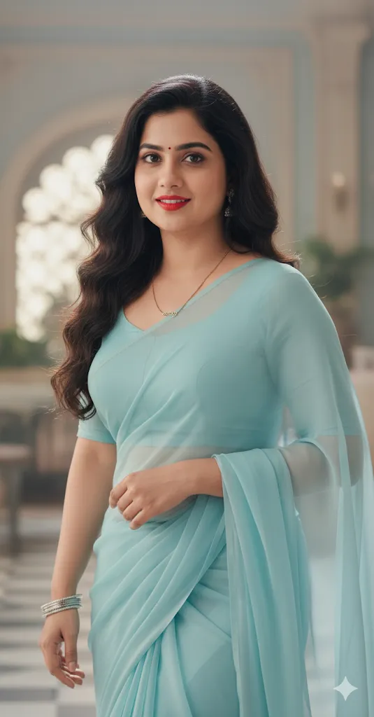 “A graceful woman wearing a sheer sky-blue chiffon saree with a matching blouse, styled in a classic and elegant drape. She accessorizes minimally with a delicate necklace, silver bangles, and a small bindi on her forehead. Her long, voluminous wavy hair flows freely, adding to the romantic and timeless look. The outfit exudes vintage Bollywood glamour, blending elegance, femininity, and charm, perfect for a dreamy cinematic setting.”Don’t change the face.