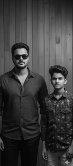 A cinematic black-and-white portrait of two men (father and son) standing together indoors. The style is natural, realistic, and high-definition. The background is a simple wooden textured wall with soft shadows, matching a classic studio vibe. Lighting is dramatic but soft, highlighting facial details and expressions, giving a timeless and elegant feel. The framing should be mid-shot (waist-up), with both men posed naturally and confidently, wearing semi-casual shirts with patterns or textures that add character. Ensure 100% accurate face matching using the uploaded reference images for both father and son, keeping skin texture, facial hair, and expressions natural. The overall mood should be stylish, intimate, and authentic, just like a professional monochrome magazine portrait. 7 Best Father and Son Prompts