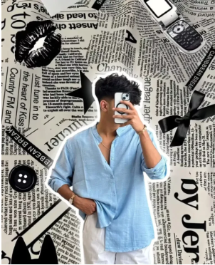 ”A young man takes a mirror selfie, his face completely covered by a white-cased smartphone. He is dressed in a light blue, long-sleeved collared shirt and white pants, with one hand casually in his pocket. He is wearing a simple gold-colored wristband or watch. The background is a dense, black and white collage of newspaper clippings and articles, creating a textured, monochromatic backdrop. Interspersed within this background are various graphic elements in black and white: a bold pair of lips with lipstick, a star, a classic flip phone, a glossy black ribbon or bow, and some loose buttons. The overall aesthetic is trendy, urban, and slightly edgy, combining fashion with a chaotic yet artistic journalistic feel, maintaining the original image’s aspect ratio.”