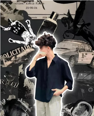 A stylish young man posing with one hand on his face and the other in his pocket, wearing a loose black shirt and light beige pants. He has voluminous curly hair and is standing against an artistic black-and-gray collage background. The collage includes elements like a police car, flying horse (Pegasus), perfume bottle, newspaper text, record label, and abstract paint textures. Aesthetic dark grunge mood with soft white outline glow around the person, realistic lighting, and portrait size composition. Modern Instagram-style HD photo edit.