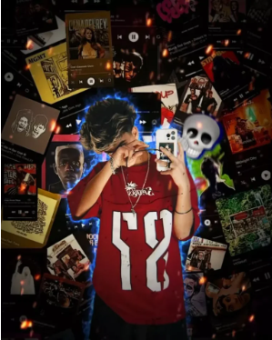 “A young man is the central figure in this dynamic, music-themed collage. He’s wearing a red t-shirt with large white numbers ’18’ on the front and a necklace with a noticeable pendant. He’s holding a white-cased smartphone in one hand, while the other hand is near his face, adjusting his hair or holding something. His figure is outlined with a vibrant blue neon glow, giving him a striking, almost electric presence. To his right, a ghostly white skull floats in the air. The background is a dense, chaotic collage of various album covers, song interfaces, and music-related imagery, all set against a dark backdrop. There are subtle fiery particle effects or light flares scattered throughout the image, adding to the energetic and edgy aesthetic. The overall style is reminiscent of a digital scrapbook or a music fan’s mood board, with a cool, youthful, and slightly rebellious vibe.”