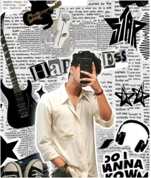 “A stylish young man captured in a mirror selfie, his face obscured by a smartphone with a dark case. He is wearing a slightly oversized, light-colored (off-white/cream) button-up shirt, with one hand casually in his pocket. Minimal accessories are visible, including a red thread on his wrist and a ring. The background is a dynamic collage of black and white elements: newspaper clippings and text, graphic cut-outs of electric guitars, headphones, stars, and bold text overlays like ‘HAPPY’, ‘STAR’, and ‘DO I WANNA KNOW’. The overall aesthetic is a trendy, urban, and artistic vibe with a grunge or pop-art influence, maintaining the original image’s aspect ratio.” Aesthetic Boys AI Editing
