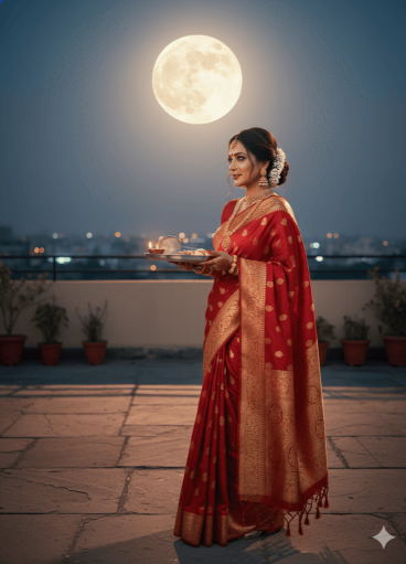 A beautiful Indian married woman wearing a traditional red saree with golden embroidery, holding a decorated Karwa Chauth thali filled with diya and sieve, standing on a terrace under a glowing full moon, cinematic lighting, realistic 8K photo. AI Karwa Chauth Photo