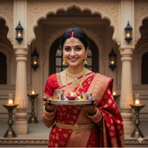 आप सभी को बता दे, कि Simple photo जिसे हम अपने फोन से लिया हुआ है, और AI की मदद से उसे और यूनिक बना सकते हैं। कि वह केवल एक फोटो न रह जाए, बल्कि एक जादुई याद बन जाए। लाल साड़ी, सिंदूर बिंदु, चाँदनी पृष्ठभूमि, थाली में दीपक Effects AI prompt लिखने पर तुरन्त उसमें जुड़ जाते हैं। इस तरह आप भी अपनी सिंपल फोटो को Unique traditional और Modernity की चमक से जगमगा उठती है।