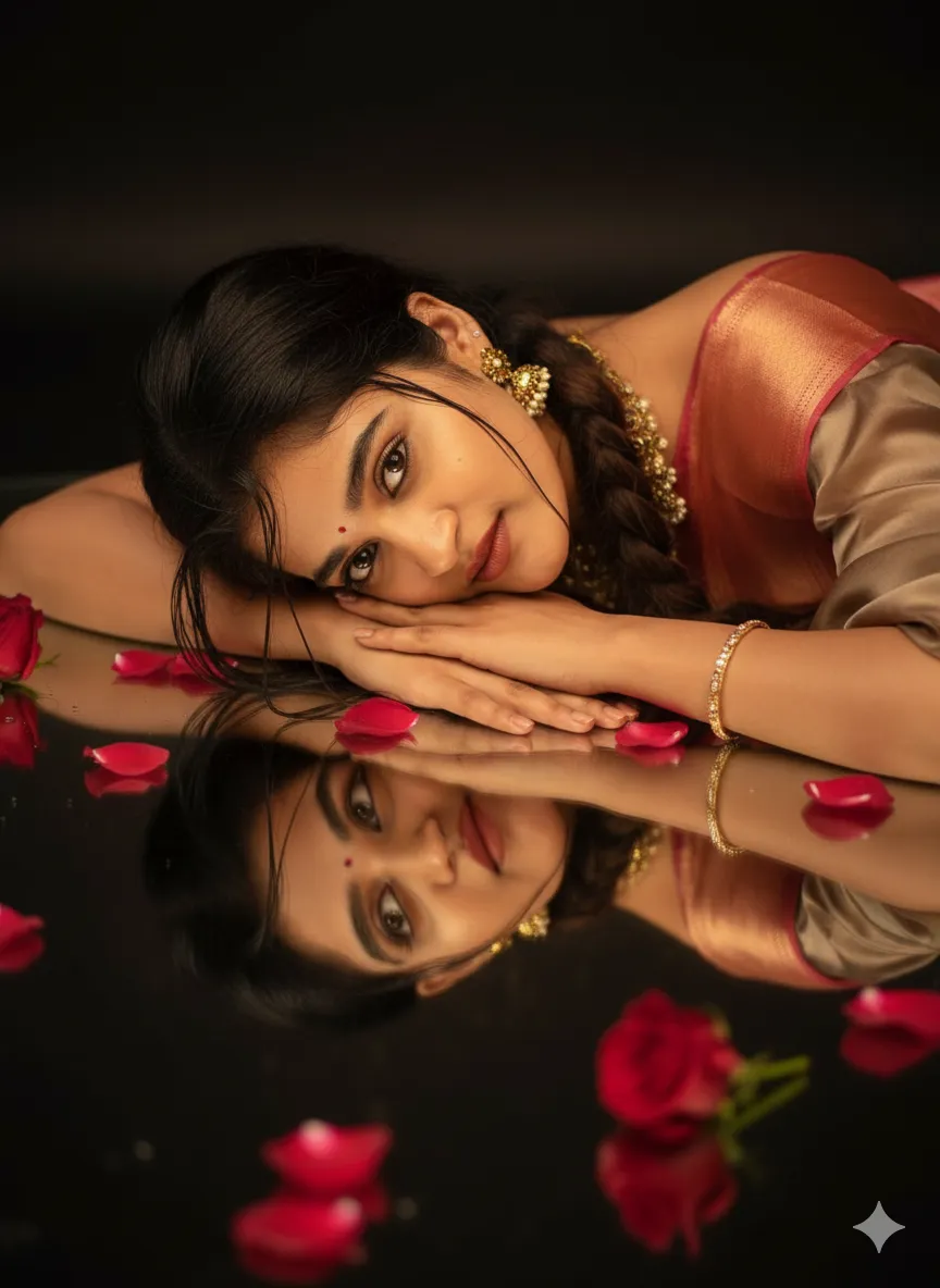 A dreamy portrait of a beautiful woman lying gracefully beside red rose her head resting gently on her arms, reflected perfectly on a glossy black surface. Soft cinematic lighting highlights her glowing skin and delicate facial features, with wet strands of hair framing her face. The mood is ethereal, romantic, and artistic, with a serene atmosphere, ultra realistic, high detail, professional studio photography, 8K.Best ChatGPT Photo Editing Prompts