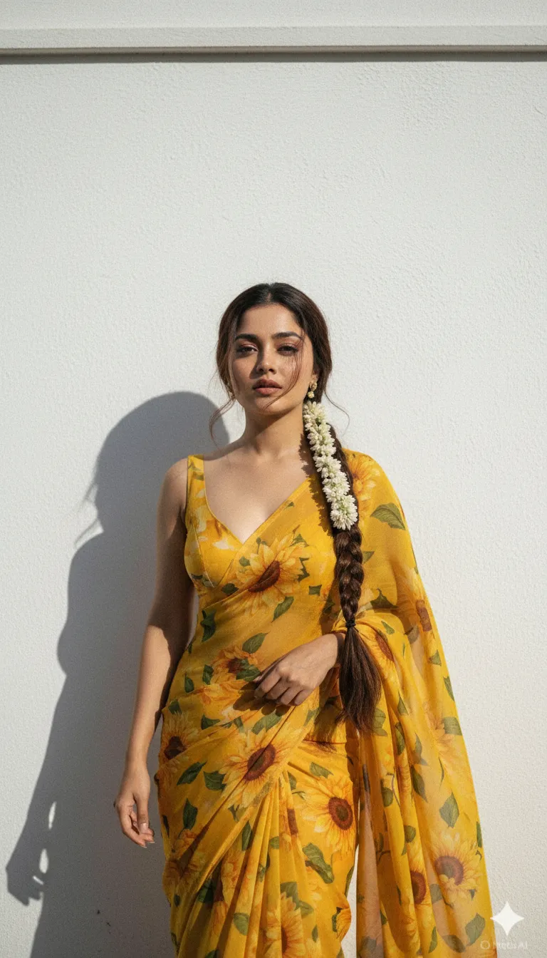grainy yet bright -based on the reference picture. The girl should be draped in a perfect yellow saree with sleeveless blouse with a deep neck Pinterest-style aesthetic retro saree. With sunflower print on the saree. The vibe must capture the essence of a 90s movie brown -haired baddie, with a beautiful long thick braid till my waist with gajra, enhanced by a windy, romantic atmosphere. She stands against a solid wall of white color where deep shadows and dramatic contrasts add mystery.Best ChatGPT Photo Editing Prompts