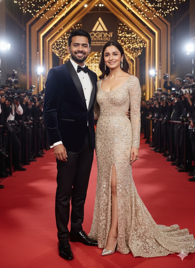 “Create a hyper-realistic photo of me standing beside Alia Bhatt on a glamorous Bollywood red carpet event, both smiling confidently, wearing elegant designer outfits, cinematic lighting, full-body shot, 8K ultra-detailed portrait.”Create Ultra-Realistic AI Images With Celebrities