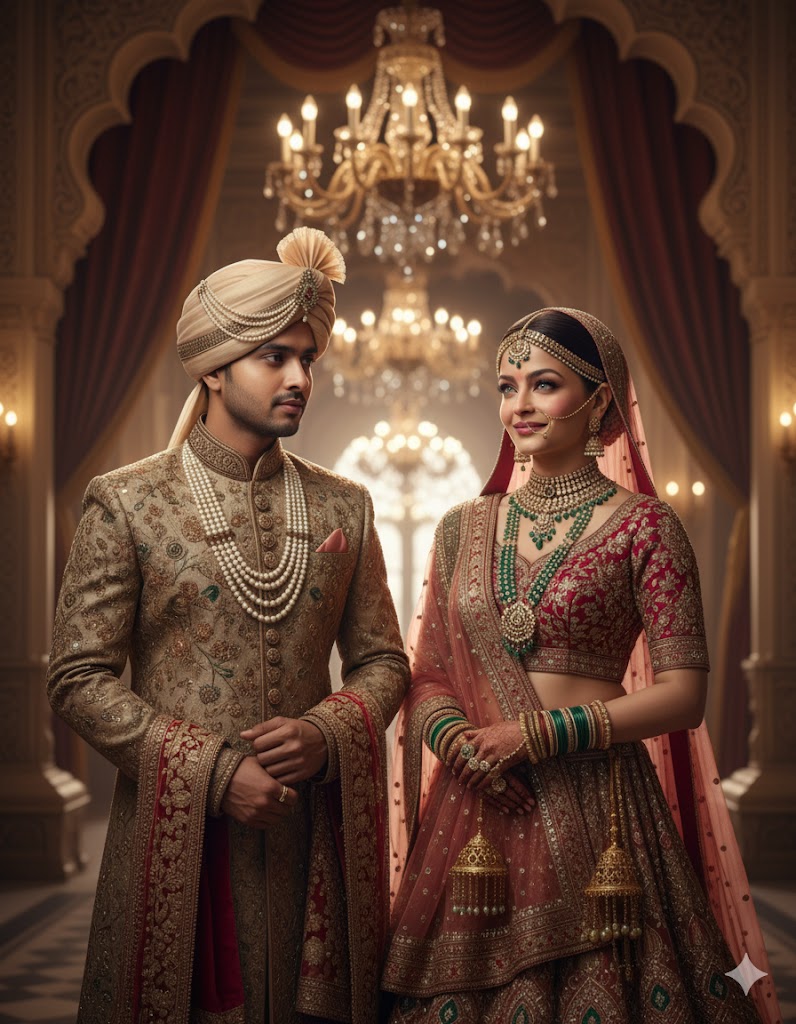 “Create a luxurious royal-themed wedding portrait of me and Aishwarya Rai in traditional Indian attire, palace background, rich gold tones, elegant jewelry, ultra-realistic lighting and fabric details.”Create Ultra-Realistic AI Images With Celebrities