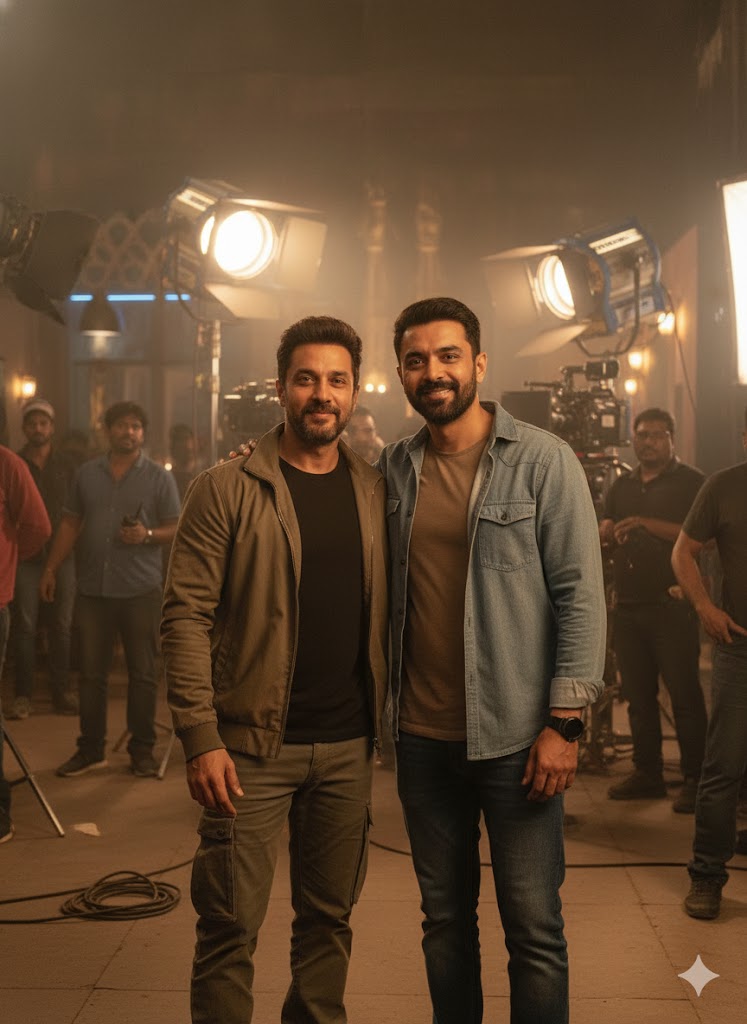 Create an ultra-realistic image of Aamir Khan and a fan smiling together on a Bollywood film set, cinematic lighting, 8K detail, professional photoshoot look.Create Ultra-Realistic AI Images With Celebrities