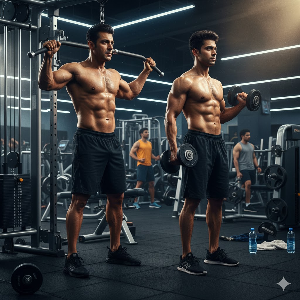 Generate a hyper-realistic gym photo with Salman Khan and a young fan working out together, muscular vibe, dramatic lighting, sweat glow, cinematic realism.Create Ultra-Realistic AI Images With Celebrities