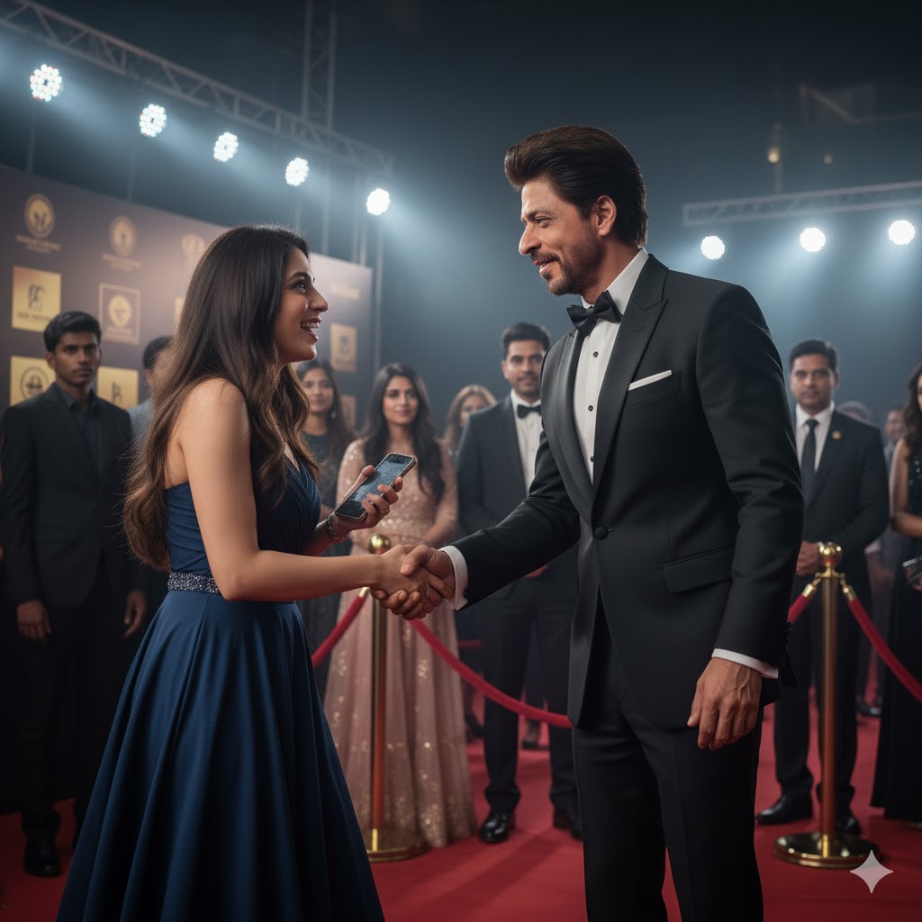 Ultra-detailed image of Shah Rukh Khan shaking hands with a fan at a film premiere red carpet, spotlights, elegant outfit, smiling pose, photorealistic clarity.Create Ultra-Realistic AI Images With Celebrities