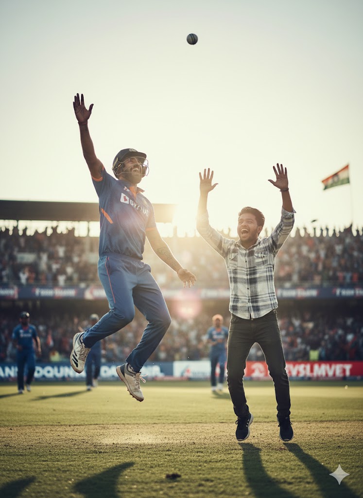 AI-generated photo of Hardik Pandya and a fan celebrating a six on the cricket field, stadium crowd in background, sunlight flare, motion realism.