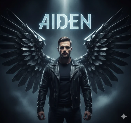 “A cinematic image of a man in a sleek black leather jacket, standing powerfully under a spotlight. Behind him, 3D dark metallic wings with silver highlights curve dramatically outward. The name ‘Aiden’ appears in bold futuristic typography glowing in icy blue. The background fades into smoky shadows, creating a moody, high-contrast Instagram look.” Gemini AI Photo Magic