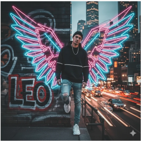 “A stylish young man leaning casually against a graffiti wall, wearing urban streetwear. Behind him, 3D wings made of glowing neon lines in pink and blue stretch outward, blending with the vibrant city background. His name ‘Leo’ is written in graffiti-style script across the wall. The overall tone is modern, edgy, and Instagram-trending.” Gemini AI Photo Magic