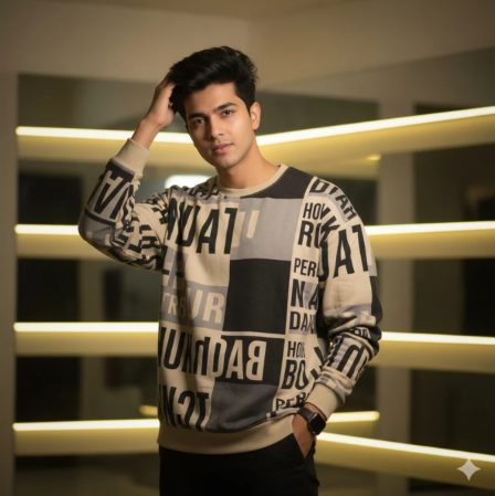 “An ultra-detailed 8K hyper-realistic portrait of a young man (using the reference face, slim build, height 5’11) standing indoors in a modern, warmly lit room. He has voluminous, perfectly styled black hair, slightly tousled for a casual yet fashionable look. His expression is confident yet relaxed, with a soft half-smile and a direct gaze toward the camera. In his pose, he raises his right hand to adjust or run through his hair, while his left hand stays in his pocket. His body is slightly angled toward the camera, giving off a playful yet stylish presence, and his gaze is soft but confident, adding charm to the portrait. He wears an oversized graphic sweatshirt in shades of beige, grey, and black with bold geometric typography patterns, paired with sleek black trousers. A subtle wristwatch is visible on his left wrist. The background features a modern mirror setup with warm yellow LED strip lights embedded horizontally, casting a cinematic glow across the scene.” Gemini AI Portrait Prompts for Men