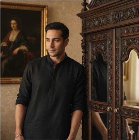 “An ultra-realistic, 8K resolution cinematic portrait of a person indoors, leaning against a beige wall next to an antique dark wooden cabinet with intricate floral carvings, mirror panels, and decorative knobs. He wears a well-fitted, deep black textured kurta with rolled-up sleeves, accessorized with a silver bracelet on his wrist. His hair is styled neatly, and his face matches the uploaded image, with the facial features remaining exactly the same. He exudes a confident and thoughtful expression as he gazes slightly away from the camera. Soft, warm lighting creates realistic shadows on his face and surroundings, accentuating the contours and fabric details. In the background, a framed classical painting adds elegance to the vintage setting, while the reflection in the mirrors adds depth. The overall scene feels sophisticated, calm, and intimate, with sharp details, realistic textures, and natural colors that highlight the ambiance of the room.” Gemini AI Portrait Prompts for Men