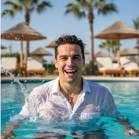 “A handsome young man is captured mid-action in a vibrant swimming pool, his head and shoulders emerging from the shimmering turquoise water. He is smiling radiantly, his teeth visible in a joyful expression. His dark hair is wet, and droplets of water are actively splashing around his head and face, creating a dynamic sense of movement. He is wearing a white collared shirt that is completely soaked and clings to his upper body. The background is softly blurred, suggesting a sunny outdoor setting with palm trees and lounge chairs under umbrellas, characteristic of a resort or luxury hotel. The lighting is bright and natural, highlighting the freshness of the scene. Dont change the face, 100% accurate face” Gemini AI Portrait Prompts for Men