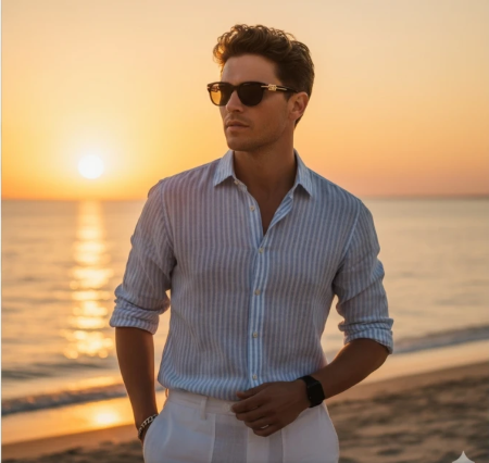 “An ultra-realistic, hyper-detailed 8K portrait of a person standing near the sea during sunset. He wears a light blue and white vertical striped linen shirt with sleeves casually rolled up, white pants, a silver bracelet, and a black smartwatch. His face matches the uploaded image, keeping the facial features exactly the same, with slightly wavy hair styled with volume and texture. He is also wearing black sunglasses with golden accents that catch the sunlight. The warm golden hour light softly illuminates his skin, casting realistic shadows and highlights. The calm sea and soft orange and yellow hues of the sky blend beautifully in the background. The man stands with one hand in his pocket and the other resting near his waist, gazing confidently to the side. The atmosphere is peaceful, stylish, and cinematic, with sharp focus on his facial features, the textures of the fabric, and the details of his jewelry.” Gemini AI Portrait Prompts for Men