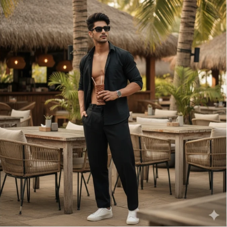 “A hyper-realistic, ultra-detailed 4K portrait of a stylish young Indian man (using the reference image face, slim build, height 5’11) standing casually in an outdoor tropical café setting with thatched-roof huts and rustic wooden furniture. He wears an open black button-up shirt with the sleeves rolled up, revealing part of his chest, paired with relaxed-fit black trousers and clean white sneakers. One hand is placed in his pocket while the other holds a decorative brown tiki-style drink cup with a straw. A wristwatch adorns his left hand, and he wears sleek black sunglasses. His hairstyle is voluminous and perfectly styled, complementing his confident summer vibe. The background features woven rattan chairs, soft sunlight, and cozy outdoor lounge decor, contributing to a warm, stylish, and modern vacation atmosphere.” Gemini AI Portrait Prompts for Men