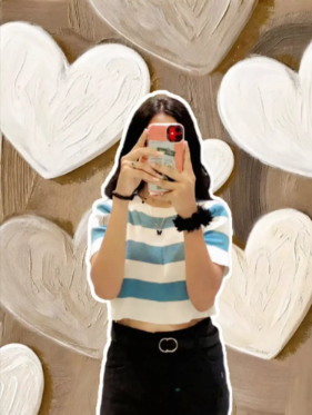 A young woman is taking a mirror selfie, holding her phone up to cover her face. She has shoulder-length dark hair and is wearing a horizontally striped blue and white crop top, black high-waisted jeans with a double-ring belt, and a black scrunchie on her left wrist. She also has a delicate necklace with a butterfly charm. The background features large, textured white heart shapes on a brown, possibly textured, surface. Google Gemini Girls Aesthetic Editing