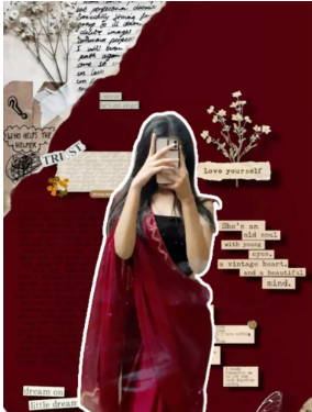A young woman in traditional Indian attire is depicted in a collage style. The background features various elements, including what appears to be handwritten text, dried flowers, and paper cutouts with phrases like “TRUST” and “Love yourself.” The overall color scheme is dominated by deep reds and earthy tones. The woman is holding a phone up, obscuring her face, and is wearing a dark top with a rich red sari. Google Gemini Girls Aesthetic Editing