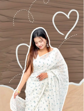 A cheerful woman with long, dark hair is depicted in a collage-style image. She is wearing a white saree with a delicate blue teardrop pattern. Her head is tilted down slightly, and she’s looking to her left with a gentle smile. She has silver earrings and several bangles on her wrist. The background is composed of two textured, hand-drawn sections: a darker brown on top with dashed white lines and two outlined hearts, and a lighter, sandy brown at the bottom with a wavy edge. The woman is cut out and outlined in white, giving her a sticker-like appearance. Google Gemini Girls Aesthetic Editing