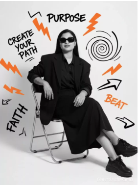 Ultra-realistic black and white vertical studio portrait (9:16) of a confident young person in an oversized black blazer, black shirt, long skirt, thick sneakers, casually seated on a simple folding chair with one hand resting. They wear black glasses. Plain white studio background with soft lighting, subtle shadows on the right floor. Around the subject are black, white, and orange hand-drawn graffiti doodles: lightning, zigzags, swirls, arrows, and motivational words: “PURPOSE”, “CREATE YOUR PATH”, “FAITH”, “BEAT”. Highly detailed skin, clean monochrome subject with bright doodle highlights. Consistent facial details, including uploaded tattoos and accessories.