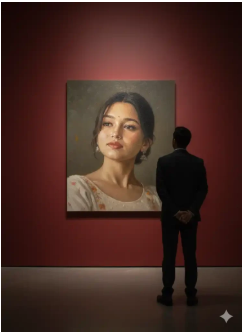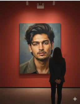 Create a scene in a contemporary art gallery using the attached image of the girl’s face and appearance, without altering her facial features.A large oil portrait of the girl hangs on the wall.Her face and upper body are painted in a realistic yet expressive oil-painting style, with textured brushstrokes and muted colors. The red wall of the gallery creates a professional exhibition atmosphere, softly illuminated by warm lighting that highlights the artwork. In front of the painting, on the right side, a man stands with his back to the viewer, observing the portrait — adding a cinematic and mysterious mood to the scene. Google Gemini Wall Painting Ai Photo Editing Prompts