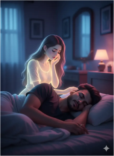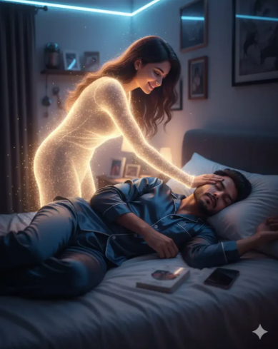 A young Indian man is lying peacefully on his bed late at night, dressed in dark and comfortable night clothes. The environment around him feels calm, intimate, and emotional. Soft neon blue and pink lights gently illuminate the room, creating a dreamy, moody, and cinematic atmosphere with a futuristic yet emotional tone.</p> <p>Beside him stands the glowing spirit of a beautiful Indian girl. Her form is delicate yet ethereal, and her entire body radiates a gentle golden-white aura, giving her the appearance of a soft, luminous angelic presence. Her expression is warm, emotional, and filled with love and longing. She gently rests her hand on the man’s cheek as if protecting him, comforting him, and silently expressing deep affection.</p>