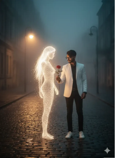 A slender Indian man (keep my face 100% accurate as the reference image) stands on a foggy, dimly lit street at night. He is holding a single red rose in his hand, offering it gently forward with a soft emotional expression. He is wearing a white blazer, black pants, and clean white sneakers — modern, classy, and minimal.</p><p>In front of him appears a glowing female hologram — a beautiful, softly illuminated digital figure formed from floating light particles. She has long flowing hair made of light and a soft white glow that blends naturally into the misty atmosphere. Her presence feels dreamy, gentle, and artistic — like a surreal futuristic vision.</p><p>The street around them is covered in light fog, with subtle reflections on wet cobblestones creating depth and realism. Dim streetlights cast warm highlights and long soft shadows, making the scene cinematic, emotional, and visually poetic. The entire moment feels like a blend of reality and imagination — calm, meaningful, and beautifully aesthetic.Neon Girl AI Prompts 2025