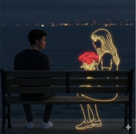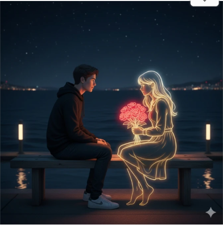 “A young man walks alone on a dimly lit path at night, wearing dark casual clothes and white sneakers. Beside him appears a Golden, glowing, neon-style illustration of a girl holding a bouquet of bright red roses. The neon girl emits a soft white light, contrasting against the dark, blurry background of city lights in the distance. The atmosphere feels calm, melancholic, and slightly surreal, blending reality and imagination. 100% accurate, my face, girl, and me sit on a bench, ocean background, looking at each other.”Neon Girl AI Prompts 2025