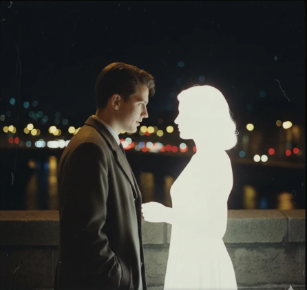 “Retro cinematic photograph of a young man (uploaded image) standing on a bridge at night, facing and softly talking to, showcasing a stark contrast between presence and absence. The girl has a delicate, feminine silhouette made of soft white light with smooth edges, appearing like a memory or dream. Both stand close, slightly leaning toward each other in conversation. The camera captures a medium side shot showing their profiles from the waist up, with blurred city lights behind them. The image should have a nostalgic retro film look-slightly faded colors, soft focus, mild grain, and natural lighting. The glow from the girl should illuminate the man’s face subtly, with realistic shadows and highlights. The overall tone should be calm, emotional, and cinematic, evoking the atmosphere of an old film still rather than a digital render. Add let texture, lens softness, and analog photo imperfections for authenticity.” retro cinematic realism, soft emotional” Neon Girl AI Prompts 2025