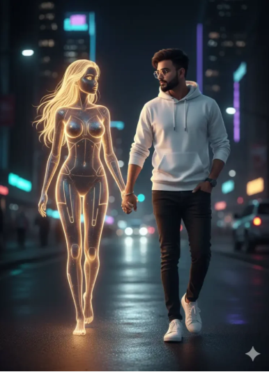 <p>Beside him walks a glowing neon-style girl, created in a beautiful golden light illustration style — like a futuristic hologram or AI-generated digital companion. Her soft golden glow casts warm reflections on the street and subtly lights up the edges of the man’s hoodie.</p>