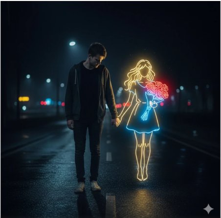 “Create an ultra-realistic image of a young man walking alone on a dimly lit path at night. He is wearing dark casual clothes and white sneakers. Beside him, include a glowing golden neon illustration of a girl holding a bouquet of bright red roses. The neon girl emits a soft white light, contrasting against the dark, blurry background of distant city lights. The atmosphere should feel calm, melancholic, and slightly surreal, blending reality and imagination. Ensure 100% accuracy of the man’s face, with both characters holding hands in the middle of the road.”Neon Girl AI Prompts 2025