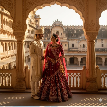 “Design a pre-wedding photoshoot for an Indian couple in a grand Rajasthani fort. The mood is regal and majestic. The bride wears a red lehenga with gold embroidery, the groom in a sherwani.” Pre-wedding Photo Magic With Gemini AI
