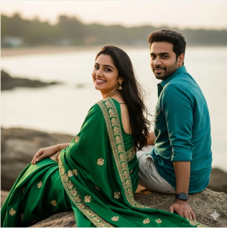 “Create a serene, romantic outdoor portrait of a couple sitting on a rocky surface by the sea. The woman is dressed in a traditional green saree with golden accents, with her hair gently flowing in the wind. She is sitting on the rocks, looking over her shoulder with a joyful expression. The man, wearing a teal shirt and beige pants, is sitting next to her, smiling contently. The background should feature a soft, blurred coastline with a hint of greenery in the distance and a peaceful, calm atmosphere. The colors are soft, warm, and natural, with the sun creating a soft glow on their faces.” Pre-wedding Photo Magic With Gemini AI