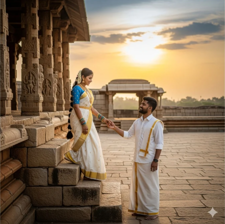 “A couple in traditional South Indian attire, with the woman wearing a white and gold saree with blue sleeves and adorned with colorful bangles and flower jewelry. The man is dressed in a simple white shirt and a dhoti with a gold border. The couple is engaged in a romantic moment, with the man standing on the ground and the woman stepping down from a stone staircase, holding his hand. The setting is an ancient heritage site with large stone structures and a scenic sky in the background, creating a warm and picturesque atmosphere.”