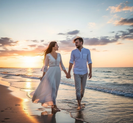“A couple holding hands and walking on a beach at sunset. The woman is wearing a flowing white dress, and the man is dressed in a white shirt and beige pants. Their hair is gently swaying in the breeze, and the sea is visible in the background. The atmosphere is calm and romantic, with soft lighting and a peaceful, natural vibe.” Pre-wedding Photo Magic With Gemini AI