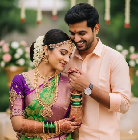 “Create a beautiful, traditional couple portrait with a vibrant, colorful Indian wedding setting. The woman is wearing a green and purple saree with intricate gold embroidery, accessorized with traditional gold jewelry, including earrings, necklaces, and bangles. She has henna designs on her hands and a soft smile, leaning affectionately on her partner. The man is wearing a soft peach-colored shirt and a watch, gently holding the woman’s hand, standing close in a loving and joyful pose. The background features a soft, blurred, natural setting with lush greenery.” Pre-wedding Photo Magic With Gemini AI
