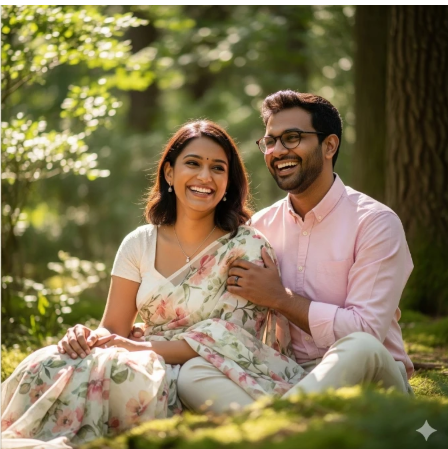 “A couple sitting together in a serene, natural forest setting, smiling joyfully. The woman is wearing a delicate, soft-colored floral saree and a simple necklace, while the man is dressed in a light pink shirt with glasses. Both are surrounded by lush green trees, sitting on the ground with a relaxed and intimate pose, showing affection and happiness. The photo captures a warm, soft, and natural light, with a slightly blurred background to create a dreamy and romantic atmosphere.” Pre-wedding Photo Magic With Gemini AI