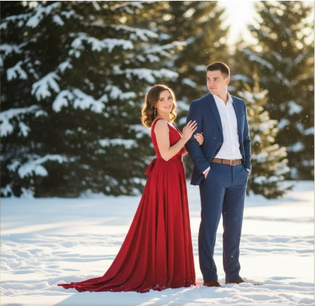 “Capture a romantic, outdoor couple photo in a snowy setting. The woman is wearing a stunning, floor-length red gown, her hair styled in soft waves, and she is standing slightly turned with a gentle smile on her face. The man is dressed in a sharp navy blue suit with a white shirt underneath, casually looking over his shoulder with a confident stance. They are standing on snow-covered ground, with lush greenery in the background. The atmosphere is serene, with a sense of elegance and sophistication in the winter landscape.” Pre-wedding Photo Magic With Gemini AI