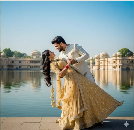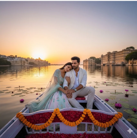“Generate a romantic pre-wedding scene on the serene lakes of Udaipur. The couple sits in a traditional wooden boat, surrounded by calm water and palace reflections. Golden hour light adds warmth, emphasizing intimacy and elegance.” Pre-wedding Photo Magic With Gemini AI